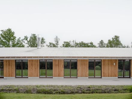 Large pitched roofs overhang to create an entrance, a covered outdoor space, or a protected work area. Reminiscent of the 18th-century experimental farmsteads that were developed in this area to cultivate this former peatland, the building's specific geometry generates a variety of silhouettes.