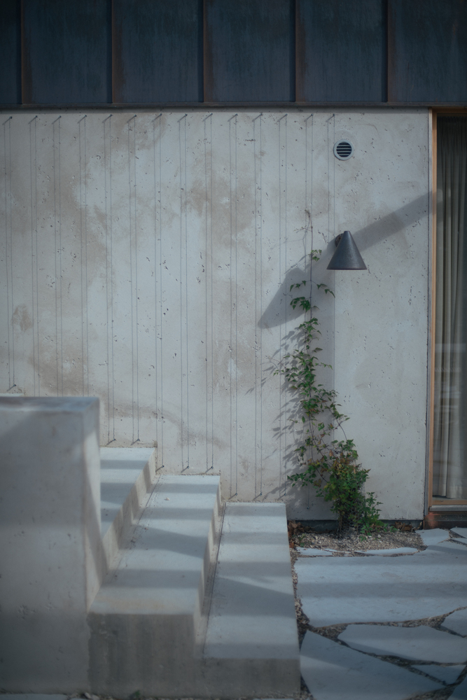 The façade with its custom-rendered surface and raw wooden pillars sit nicely next to low pine trees and the desaturated palette of the surroundings.