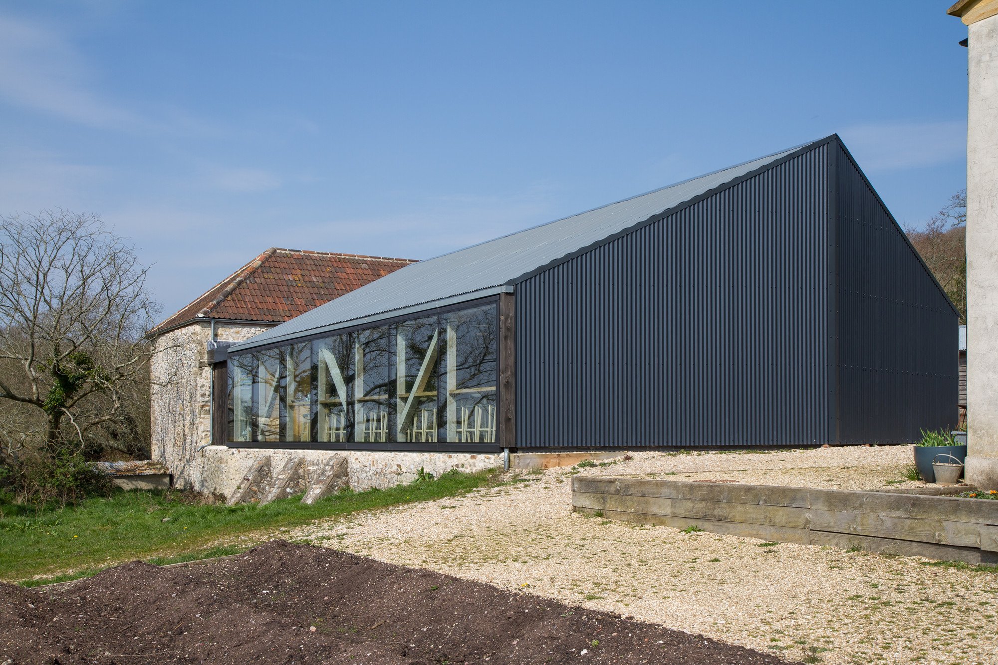 The existing farm site included a 17th century Cobb farmhouse, an 18th century chert-threshing barn. The farmhouse was renovated to function as a sustainable inn for visitors to River Cottage events .