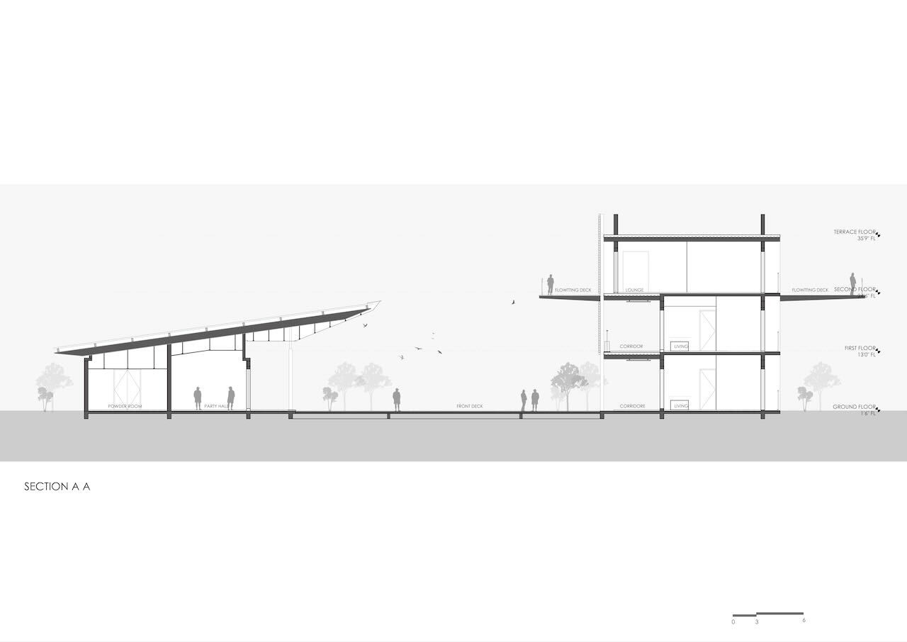 The gathering zone with the Party hall is placed at the end of the sequence, giving an interconnecting Dining, for it to use the centrally formed decks and the amphitheater at the back with the larger volume of openings that suggests infinite visual connection throughout for their congregations.