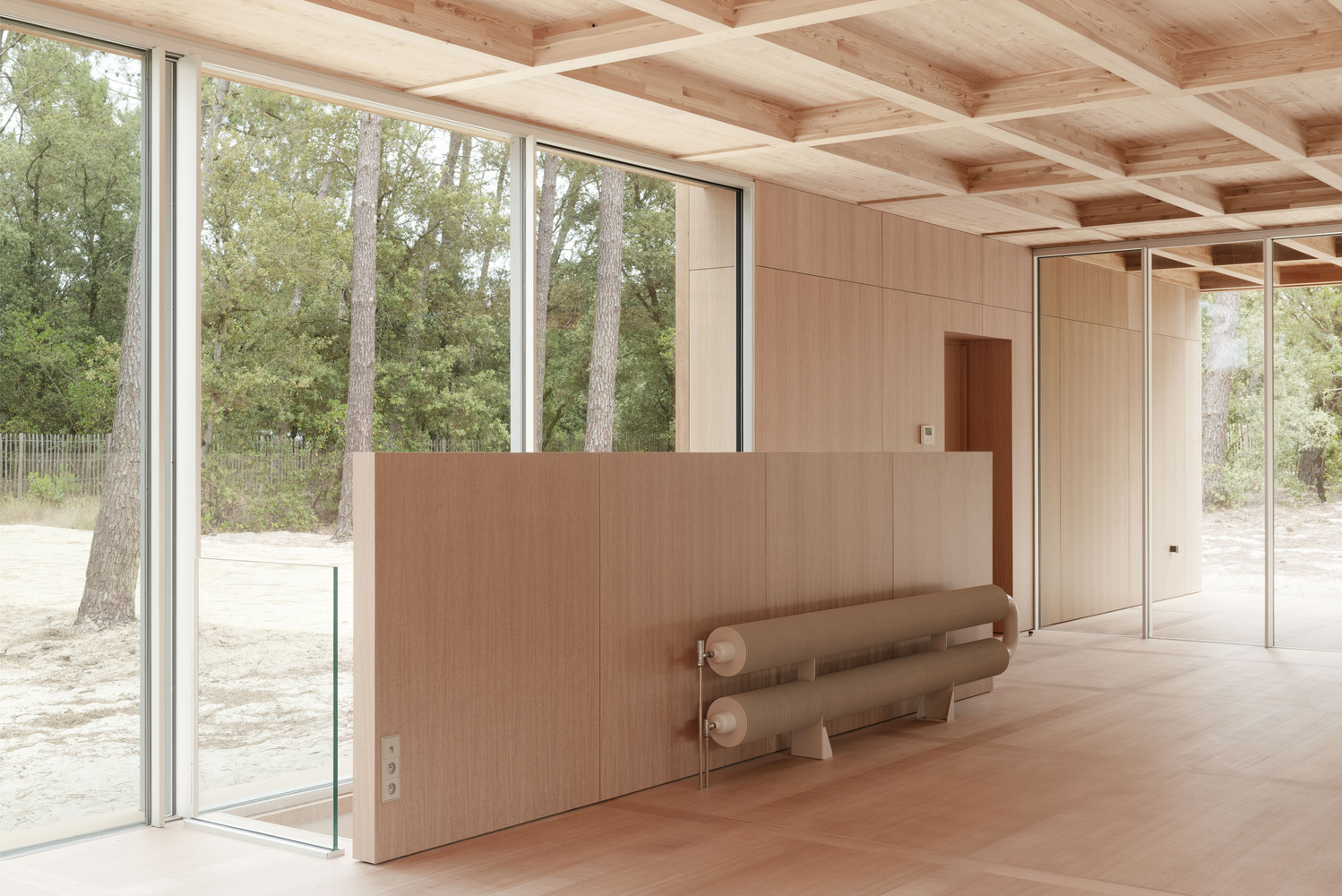 The floor and the ceiling mirror each other’s dimensions, breaking down all notions of hierarchy. Eyesight glides between pine trees and interior perspectives, feet wander with ease from the warm sand outside onto the supple okoume wood flooring indoors.