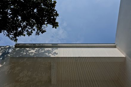 Between the corridor and courtyard, a row of glass doors brings a continuum of inside and outside spaces.