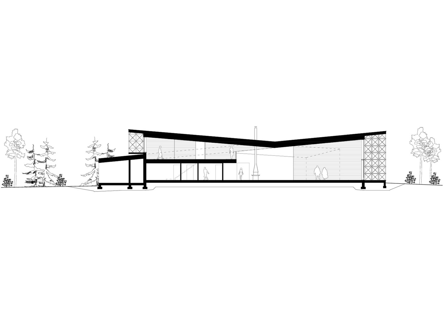 There are terrace spaces at the end of the fingers of the restaurant area, with a lac structure acting as an informal boundary between people and the surrounding nature, an to cast interesting shadows on the surrounding environment.