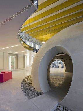 The two "pebbles" lying on the floor, unique enclosed spaces of the building are made of a metal structure covered by a thixotropic concrete shell. The « magic boxes », animation and story-telling
