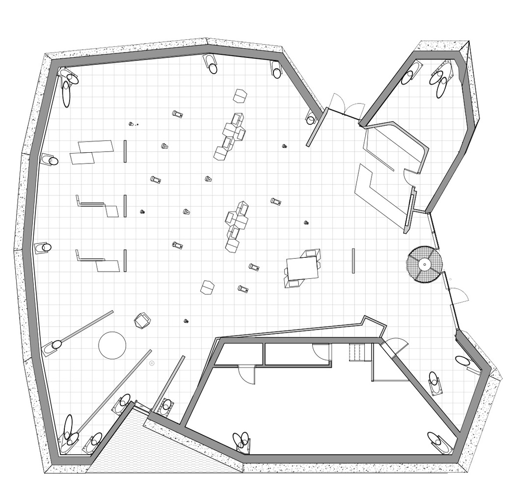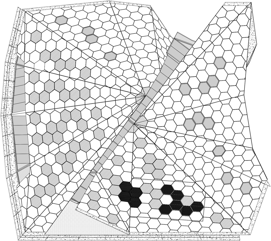 The skin of the building derives its geometry from early structural concepts using hexagonal shapes derived from honeycombs to establish rigid diaphragms.