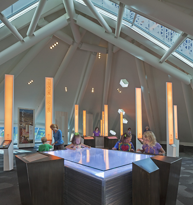 To further the concept, its building envelope or skin, imitates nature by shielding itself with hexagonal-shaped honeycomb cladding designed to protect the interior from rain, snow and wind, as is the nature of a beehive. The interior space and exhibits inform visitors to see the world of plants through a scientific lens.