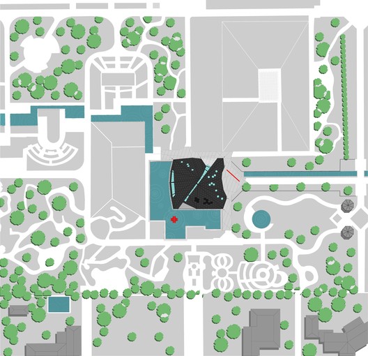 The Pyramid is also diagonally divided into two sections and pulled apart slightly to create a visual connection along a diagonal axis with the existing Four Towers water feature on the southwest corner.