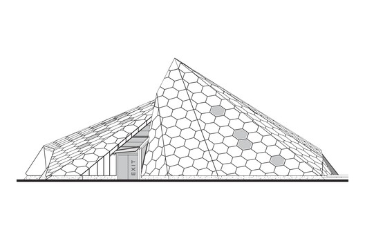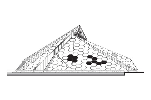 The Pyramid's technologically advanced, high performance skin (façade), designed by Studio NYL, is clad in four-foot-wide hexagonal-shaped ventilated Swisspearl fiber-cement panels that mimic the geometric efficiency of nature's wax honeycombs. Thirty panels feature photovoltaic collectors tasked with gathering energy for interior exhibits.