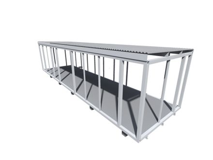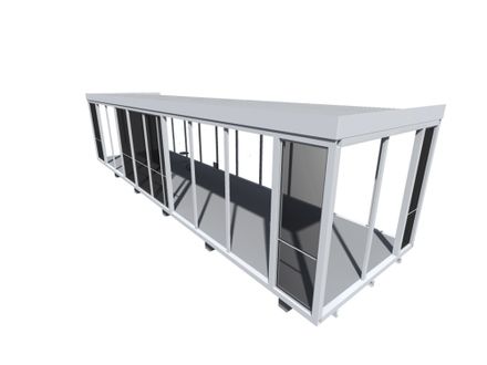 Functionally, the 36m2 core (12m long x 3m wide x 2.40 m high) consists of a kitchen with a living room and work desk, a bathroom and a master bedroom.