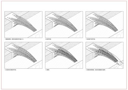The handrail of the bridge deck is integrated with the bridge body and becomes the main structural height, while the bridge deck is relatively gentle and easy to walk. The arc on the bridge body is the tension bar, and the straight one is the compression bar, which effectively avoids the disadvantageous weakness of bamboo bending.