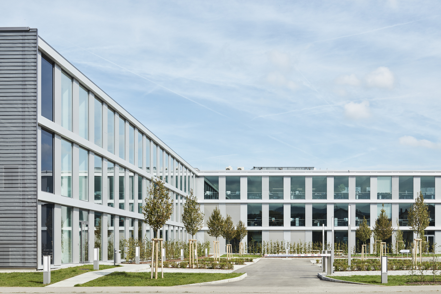 The production hall is a steel framework, whereas the office building is a solid reinforced concrete construction with a curtain wall facade.