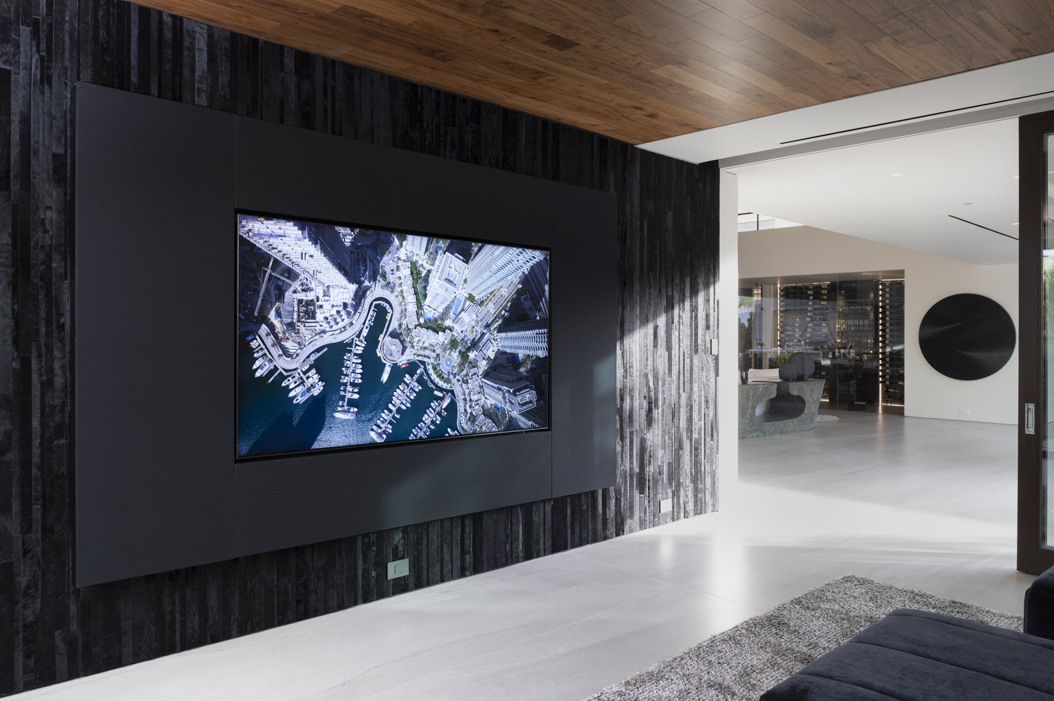 Clerestory windows at the roofline are an essential design element. The home theater can be open for casual TV watching with views of the entry pond or turned into a mini theater with closed doors and blackouts rolled down.