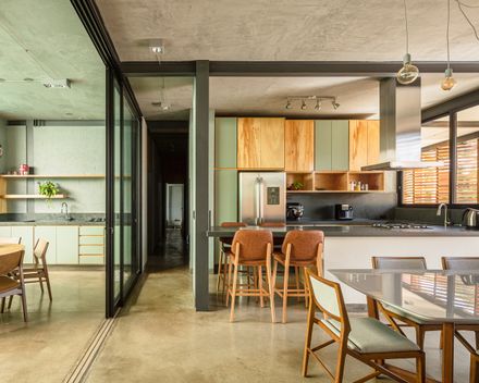 With linear organization, all rooms open to the view of the forest that, in addition to a generous balcony to contain the morning sun, brises were also installed to contain the afternoon sun.