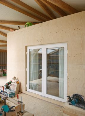 In addition to lighting and ventilation openings, the shell also includes two sliding doors that open the hall to the garden.