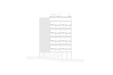 The building has an access patio that is at a lower level than the street, through which there is access to a lobby that connects with both parking levels.