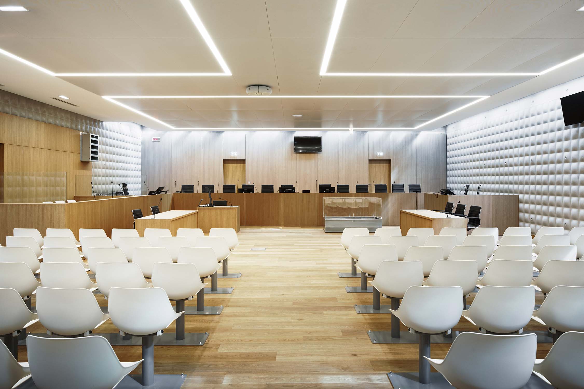 From this mineral thickness, the floor emerges among the two new courtrooms, fully clad in a metal "drape" consisting of perforated stainless steel folded sheets.