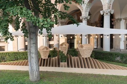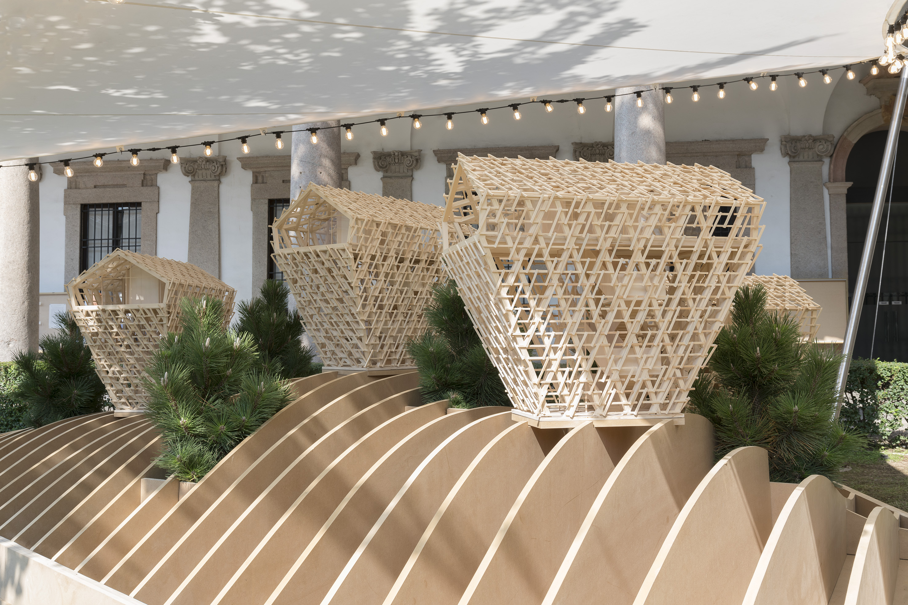 The five chalets presented at the Fuorisalone exhibition, an event curated by Interni Magazine on the occasion of Salone del Mobile 2021, are located in the courtyard of the Statale University in Milan.