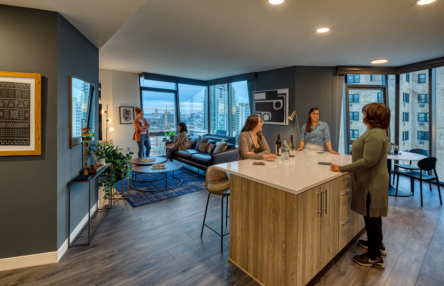The facade is angled to create generous outdoor spaces on top of each tier, providing terraces for a quarter of the apartments, as well as shared amenity space for the resident community atop the green roof podium.