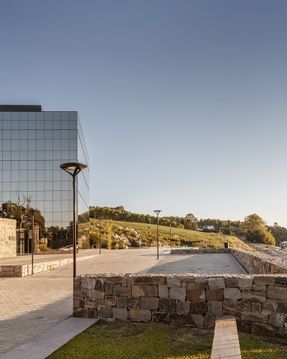 It's a project where basalt rock, concrete, and metal blend in composition with vegetation and the local landscape.