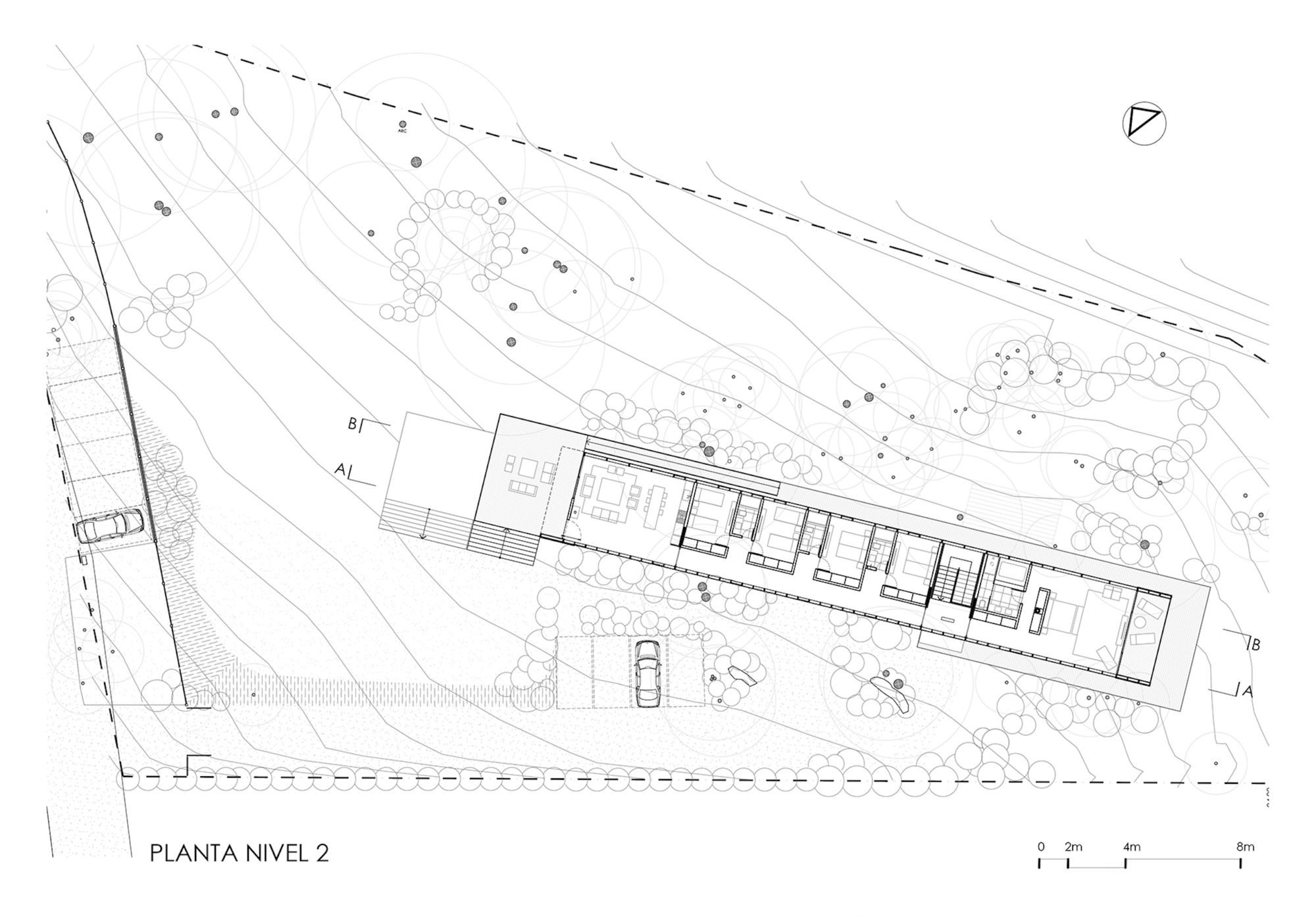 Given the beauty of the forest, the first decision was to intervene as little as possible in the place. With this premise, there is a tree-free strip of approximately 6 meters that is also advantageously located in the direction of the contour lines.
