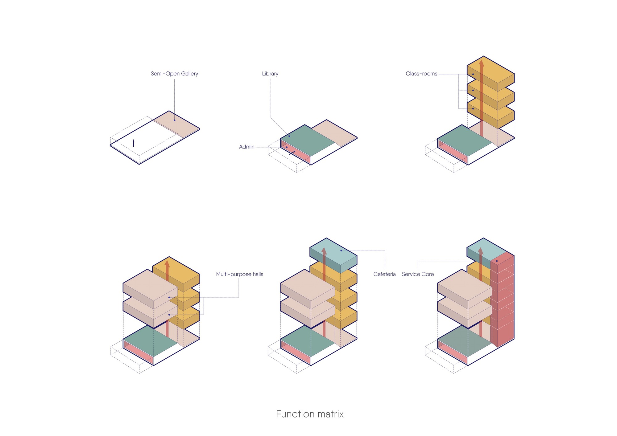 At the fourth level, the staircase comes out of the building and faces the dorm of a spiral stair leading up to a rooftop cafeteria, which opens out into a landscaped terrace on the south.