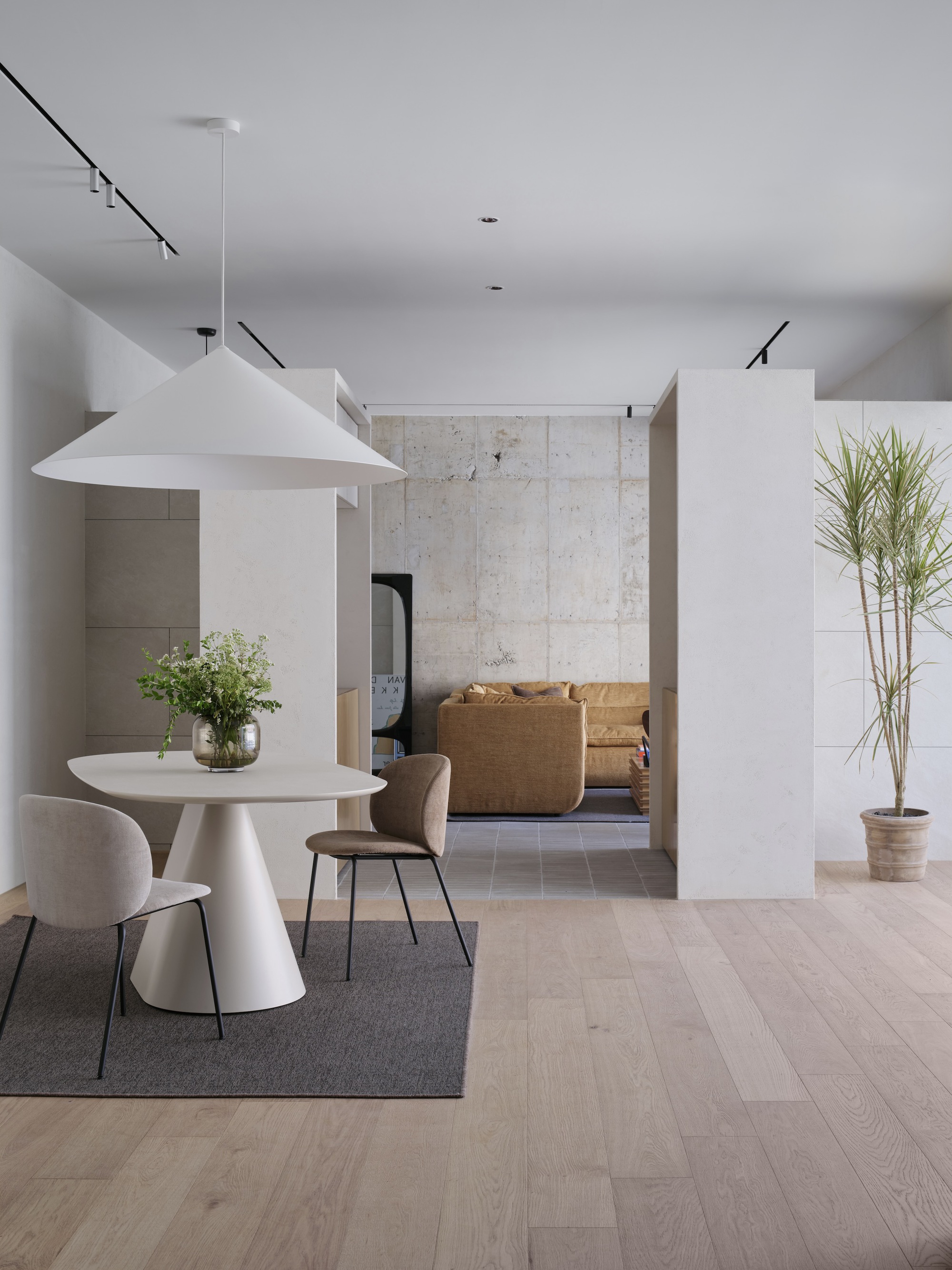 The brand's minimalistic character is reflected in a single surface finished with uniform materials, connecting walls, floors, and the staircase's handrails across interior and exterior spaces.