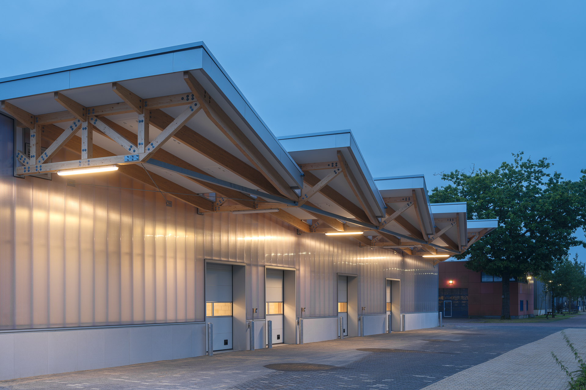 On the side of the expedition areas, the trusses form a canopy with a generous overhang under which loading and unloading can take place in a dry and sheltered environment.