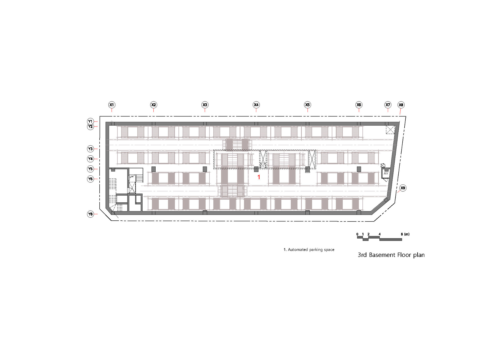 The arrangement of parking and evacuation routes significantly influenced the design. The site's limitations necessitated a mechanized parking system to ensure efficient parking and ample waiting space. For quick and intuitive evacuation, fire escapes were placed at both ends of the building.