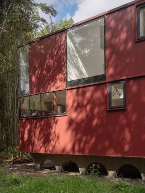 Located within a dense forest in southern Chile, near Puerto Varas, this residential project takes shape as a compact volume elevated on arched foundations that help minimize contact with the ground while emphasizing the intersection between two dissimilar horizontal planes.