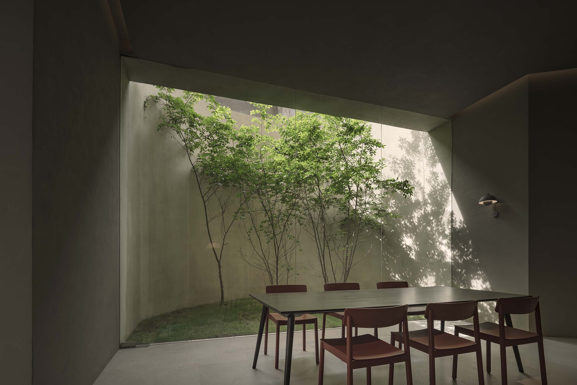 This forest area, in coordination with the movement of the sun, casts unique light and shadows on the seasonal trees below, giving the space a timeless and eternal feeling.
