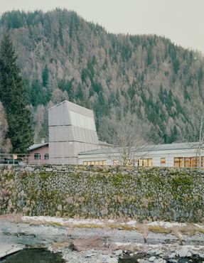 The plan is polygonal with a sloping roof section; the pigmented concrete cast on-site, the different vertically staggered faces, and the varying degrees of sandblasting, although complex in construction, represent a sincere and simple architecture.