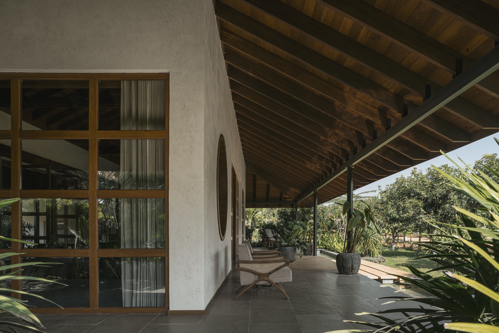 As one approaches the farmhouse through a narrow passage, set within a mango orchard, one is greeted by an inviting building with expansive semi-open verandas.