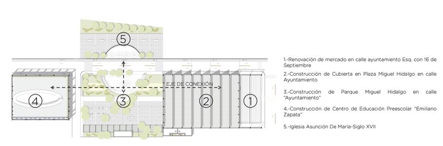 Taking this construction as a starting point, a pattern emerges to continue the sloped roofs in the sports court and multi-purpose covered plaza that propose a human and urban scale for the municipality and for pedestrians.