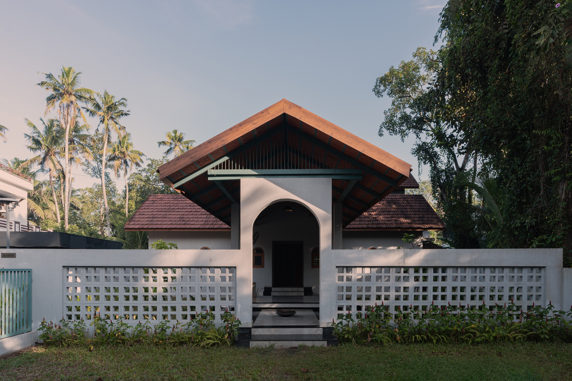 The deliberate choice of cyan blue rafters and purlins reflects the vibrant hues of the Kaalakettu ritual from the Oachira Mahotsavam, connecting the home to the region's festivities and spirit.