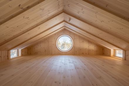 Integrated within the wooden structure, floor-to-ceiling glazing invites the landscape inside, dissolving the boundary between interior and exterior and highlighting the landscape's ever-changing scenery on which the cabin life is based.