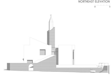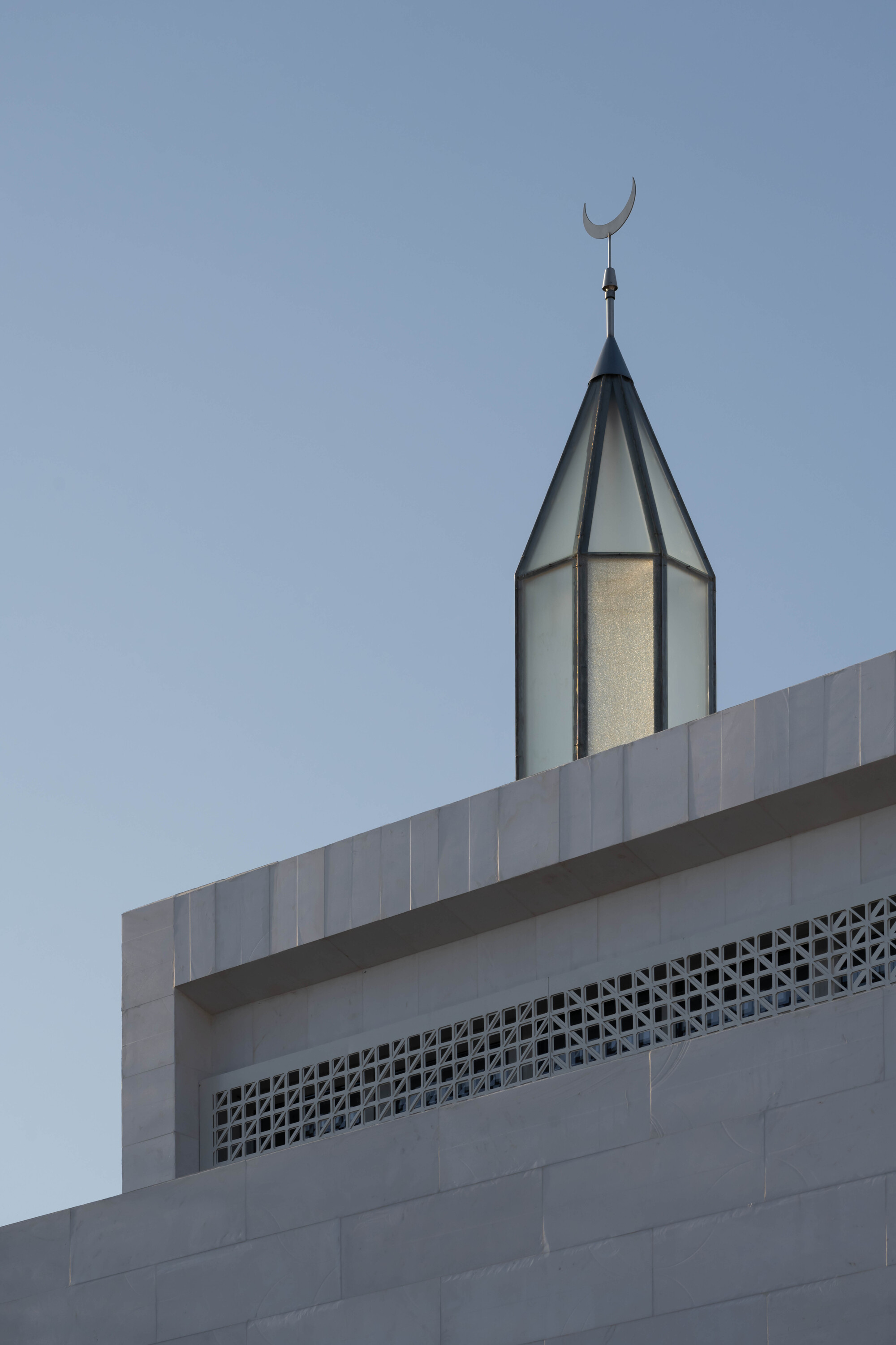 The fence and the minaret are covered with brushed stone with a distinct tactility, which contributes to the contrast of the white, smooth marble used to cover the main building.
