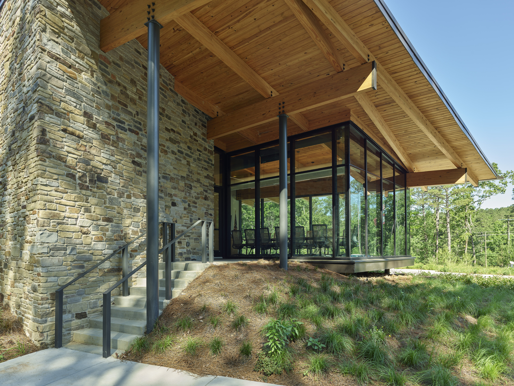 While other state parks in the Ozark and Ouachita mountains have a variety of historic lodges and structures from the Civilian Conservation Corps (CCC) period that set their architectural style, Pinnacle Mountain did not have a precedent; its urban connection, and the younger city patrons that canoe, kayak, hike, climb and bike the mountain said it should connect in a different way.