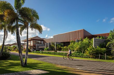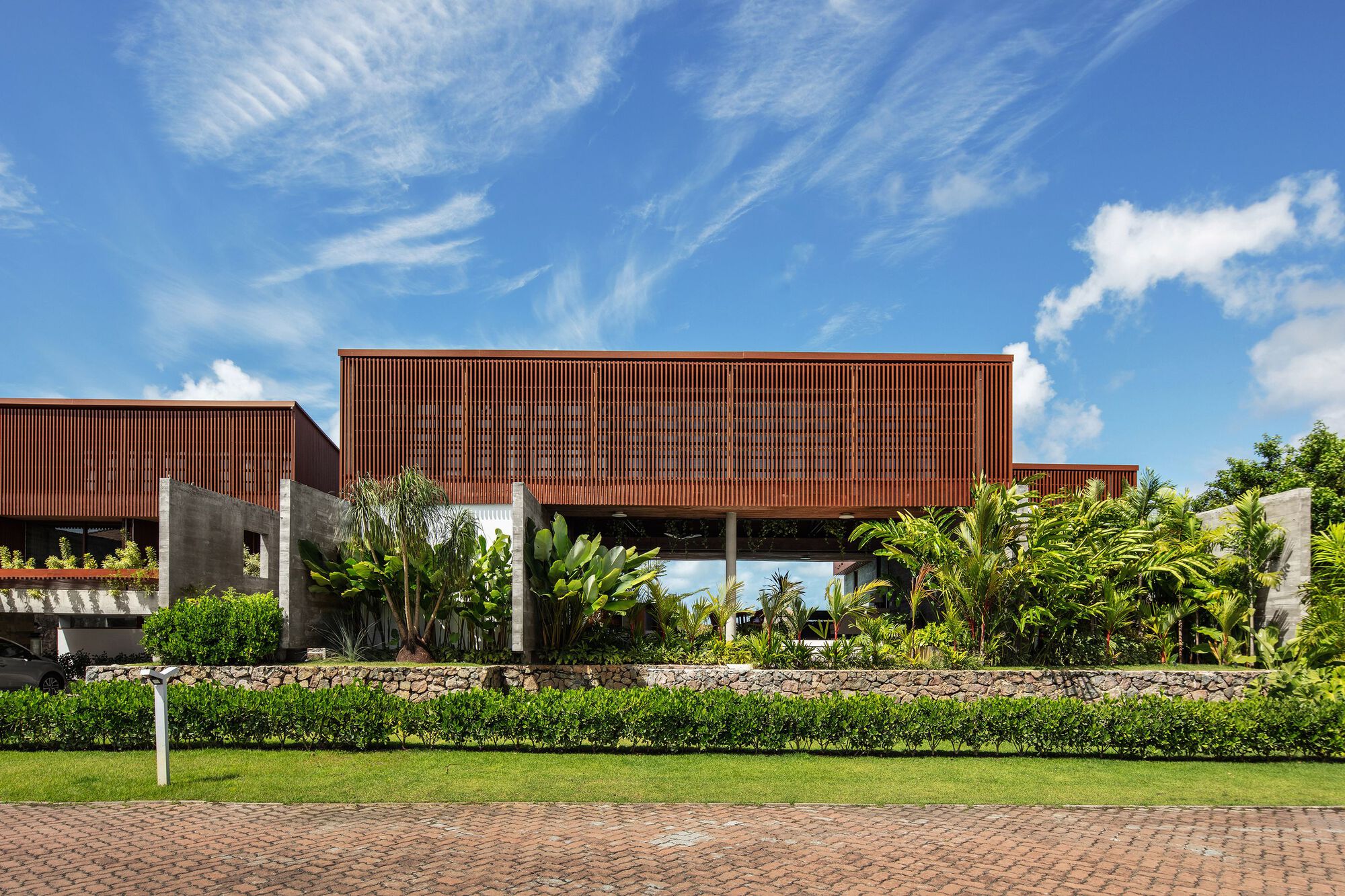 The final construction layer consists of the roofs and shading louvers, which are supported by the concrete structure and are all made of wood.