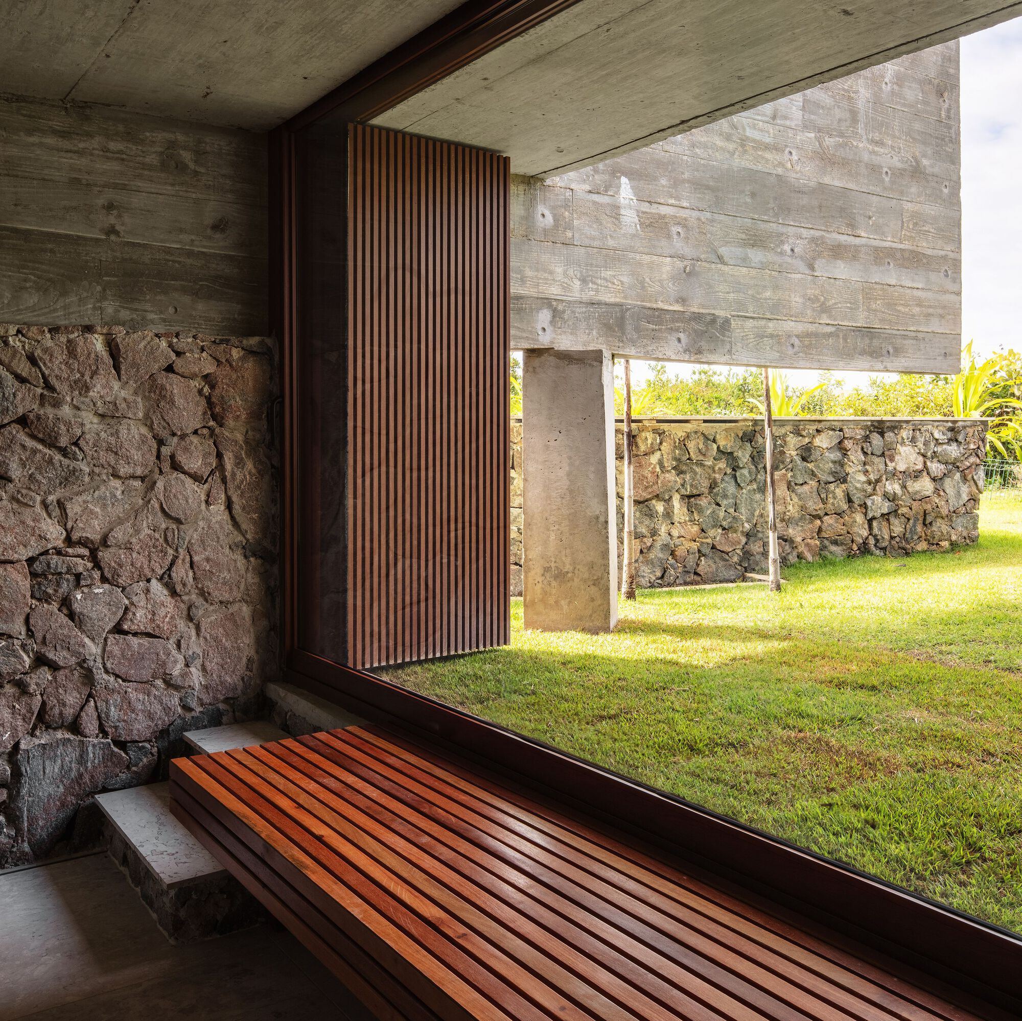 The house has a base made entirely of local natural stone, which forms the solarium, pool, entrance gardens, and retaining walls for the bedrooms.