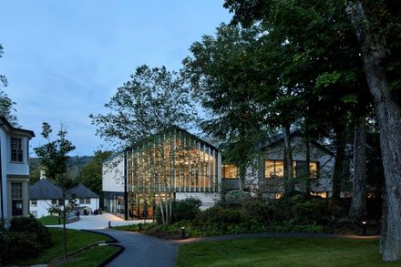 Materiality is inspired by the wooded and rocky nature of the site and the vernacular architecture of the campus and region, focusing on a simple palette, uniformity of colors, and treated materials.
