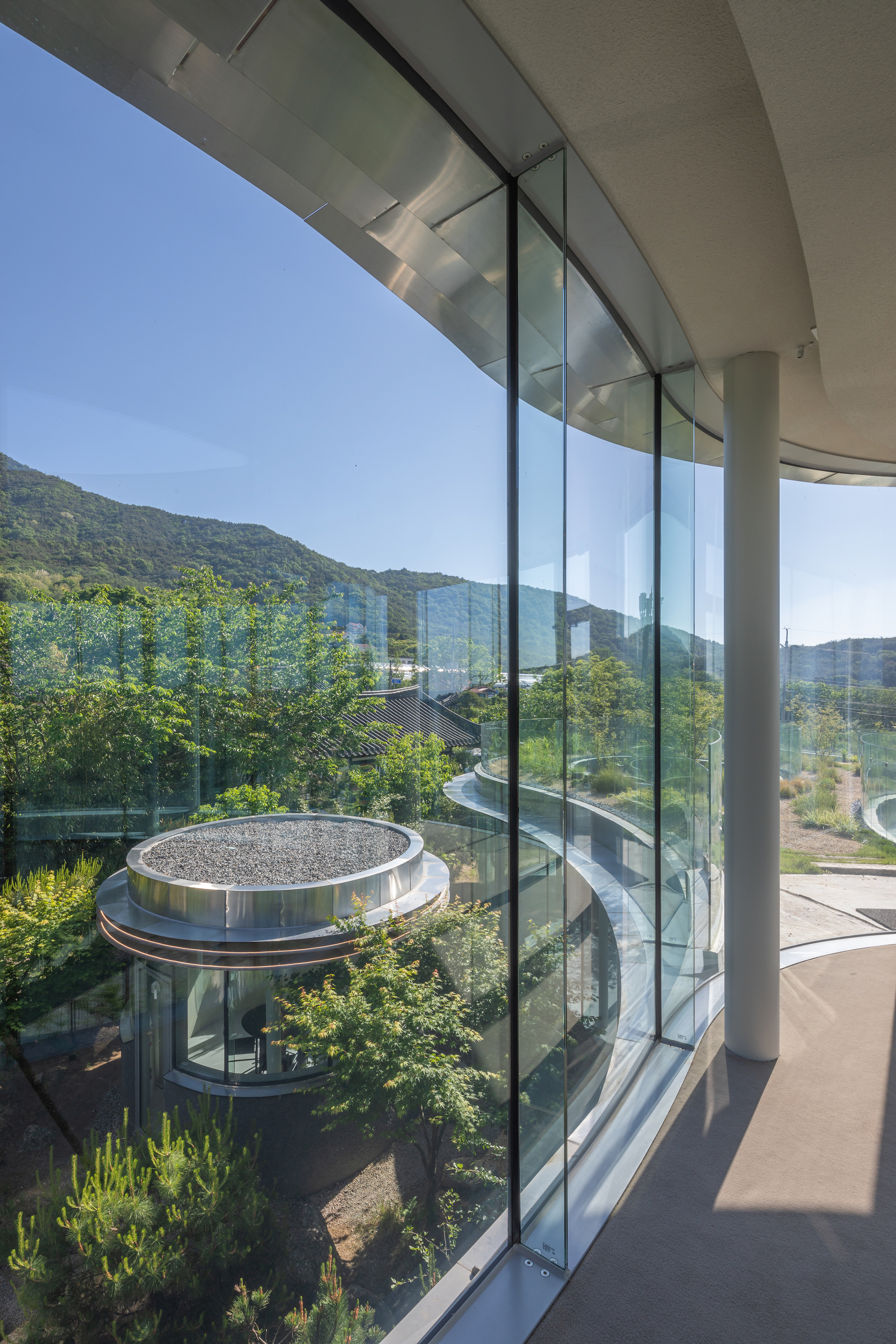 Stainless steel eaves trace the building's curves, regulating sunlight and reinforcing the flowing form.