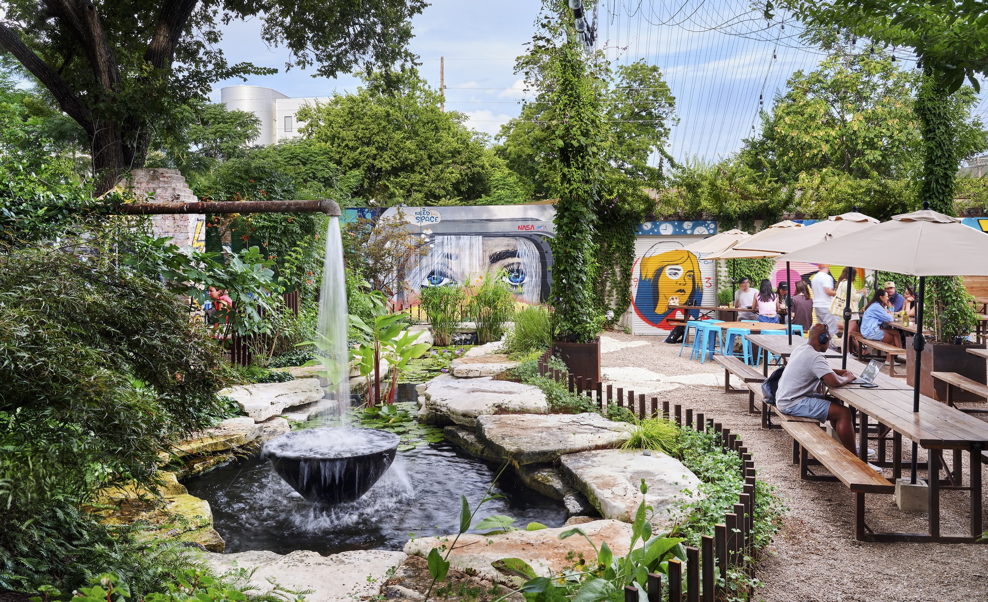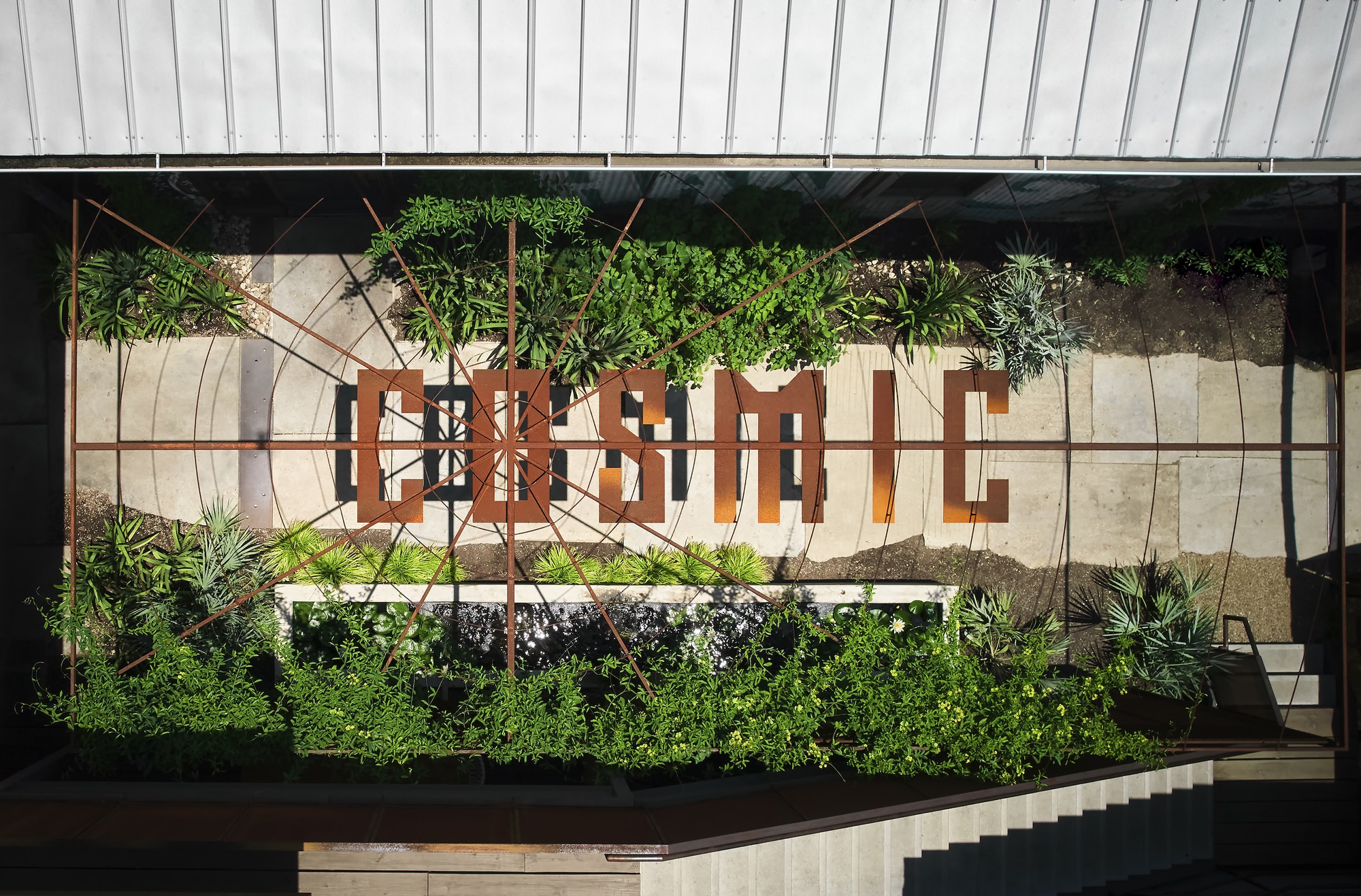 Upon entering the complex, signatures of the Cosmic brand come into focus: water features, fig ivy climbing steel trellises, and custom signage. The two buildings required stabilization prior to the renovation and have been entirely transformed.