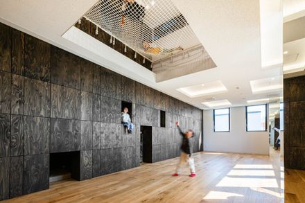 The raised platform, "Koagari Space," engages children's senses. The "Atelier Space" flourishes children's imagination. The "Play Space" strengthens children's physical health.