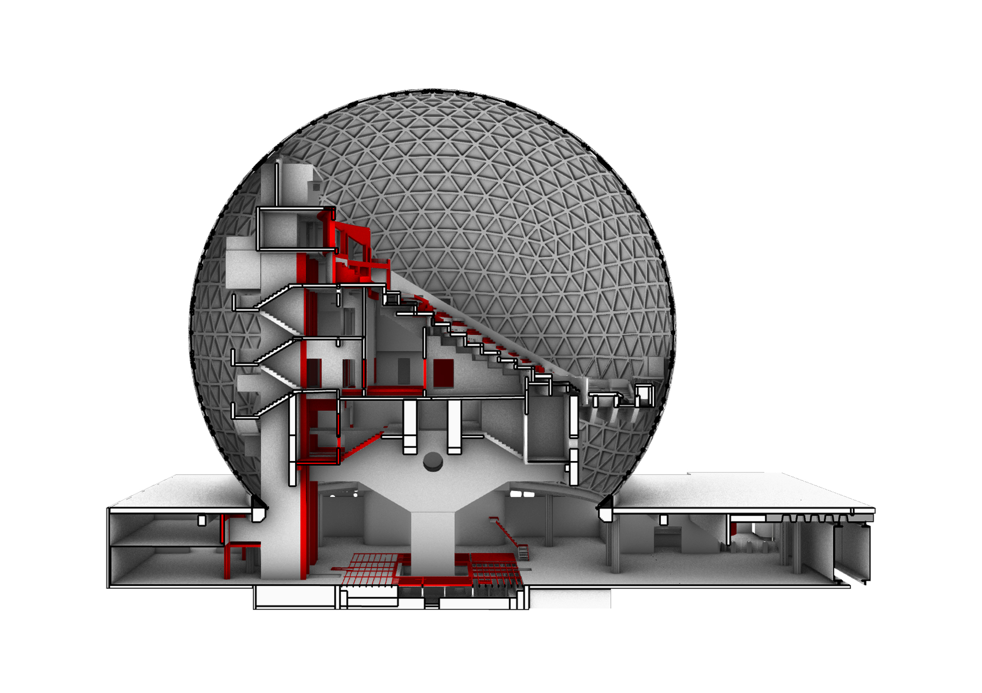 A foyer allows visitors to observe the spherical structure close up _ This is not for the faint-hearted. The auditorium is now equipped with a new 1,000 m2 hemispherical screen, specifically designed for a new 4K laser projector, complemented by an IMAX 6.0 sound system.
