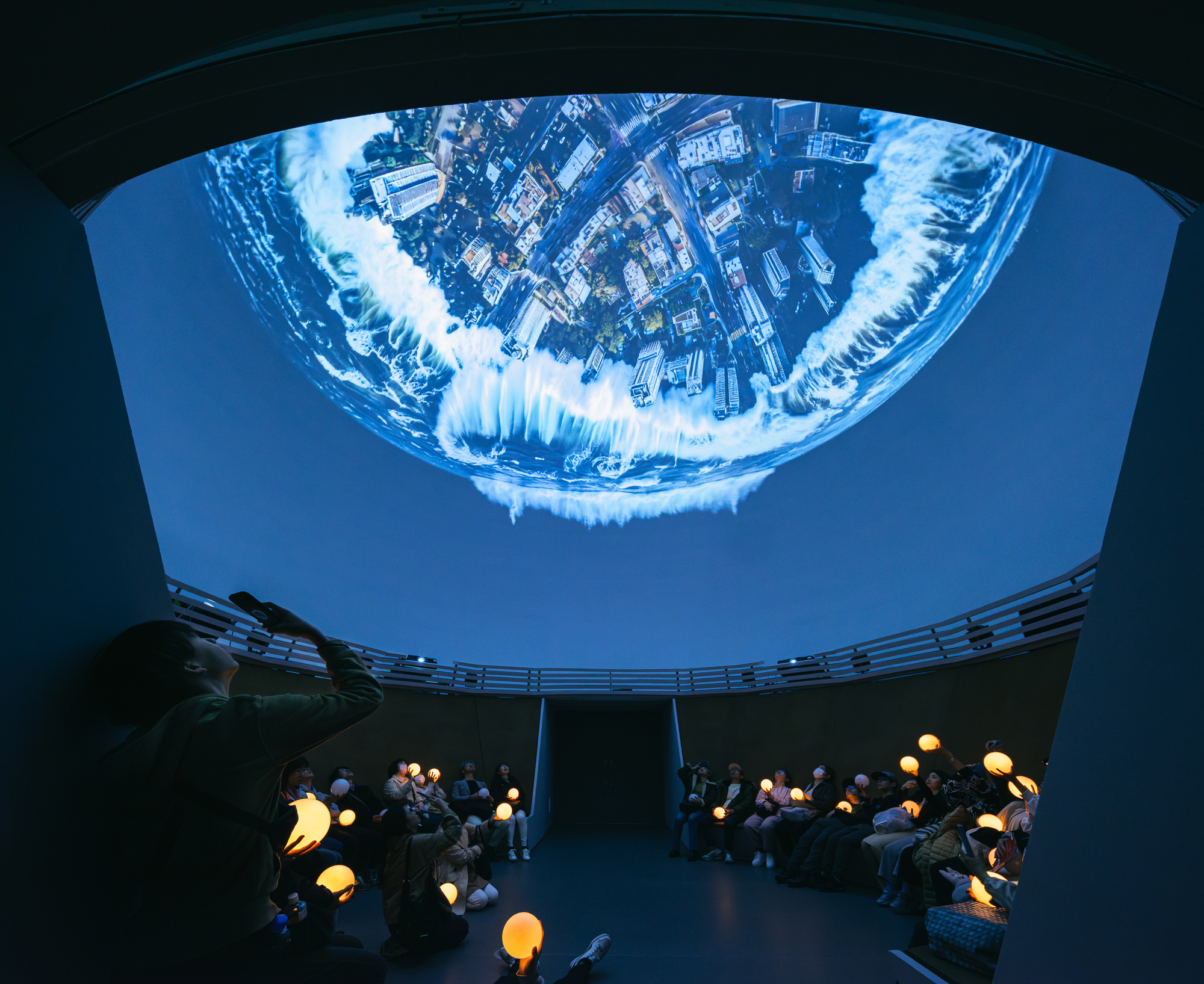 The highlight of the visit is the central glowing sphere, where guests can experience the world's first AI-generated 360-degree dome film.