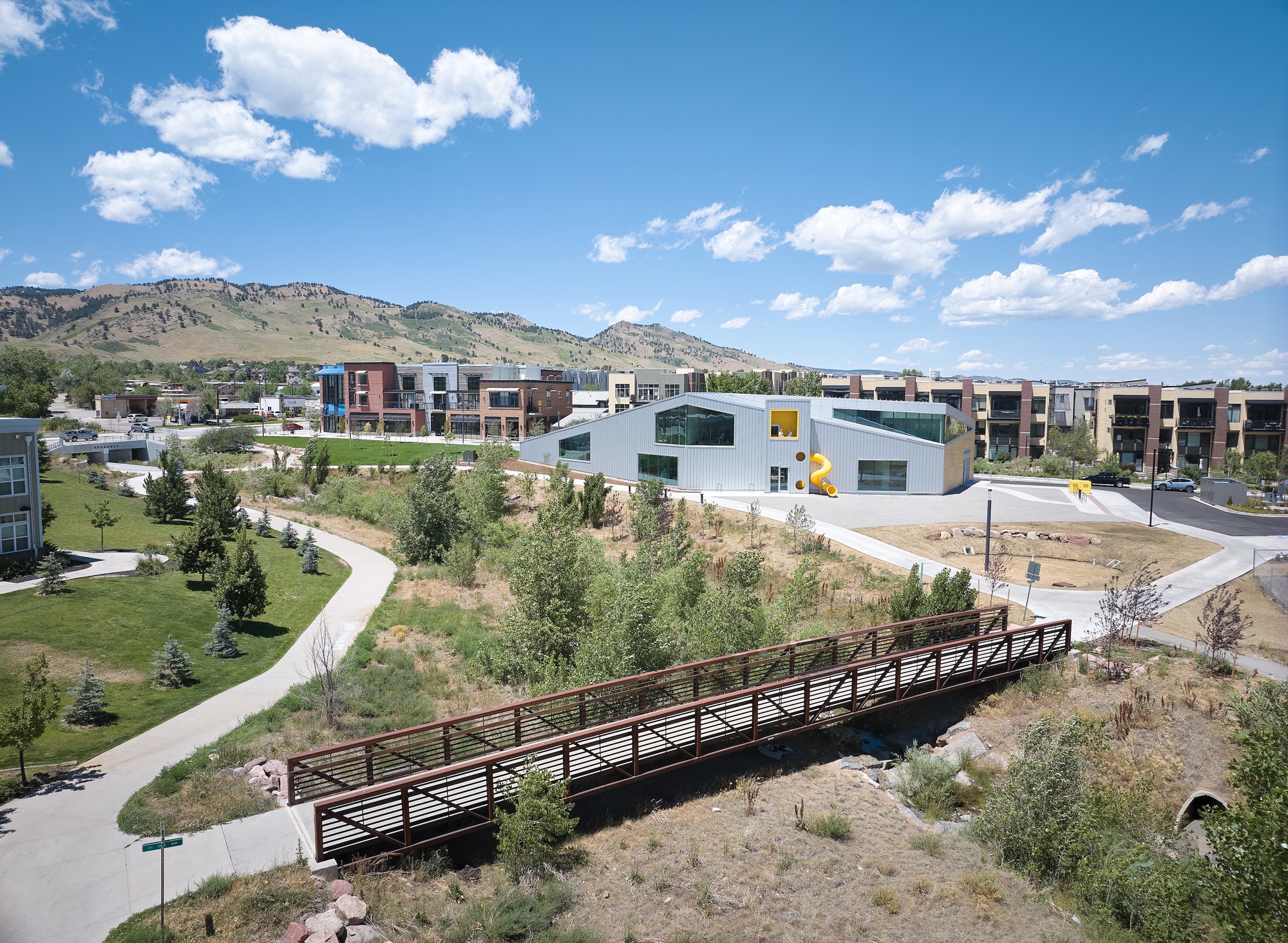 The chosen site is a triangular plot bordered by Broadway to the west and Three Mile Creek to the south, with stunning views to the Boulder Flatirons. WORKac's approach to the project was deeply rooted in community engagement.