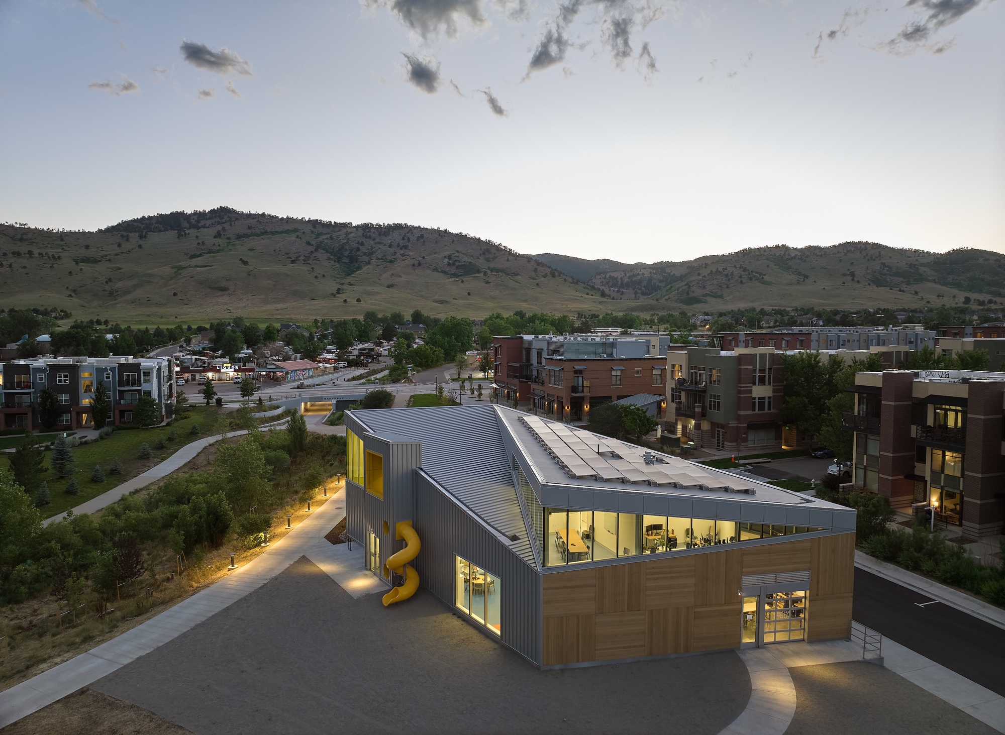 The building negotiates the triangular site that includes a seasonal creek running diagonally through it with a building that respects the scale of its residential neighbors to the north while opening up to views of the Flatiron Mountains and Rocky Mountain foothills to the south and west.