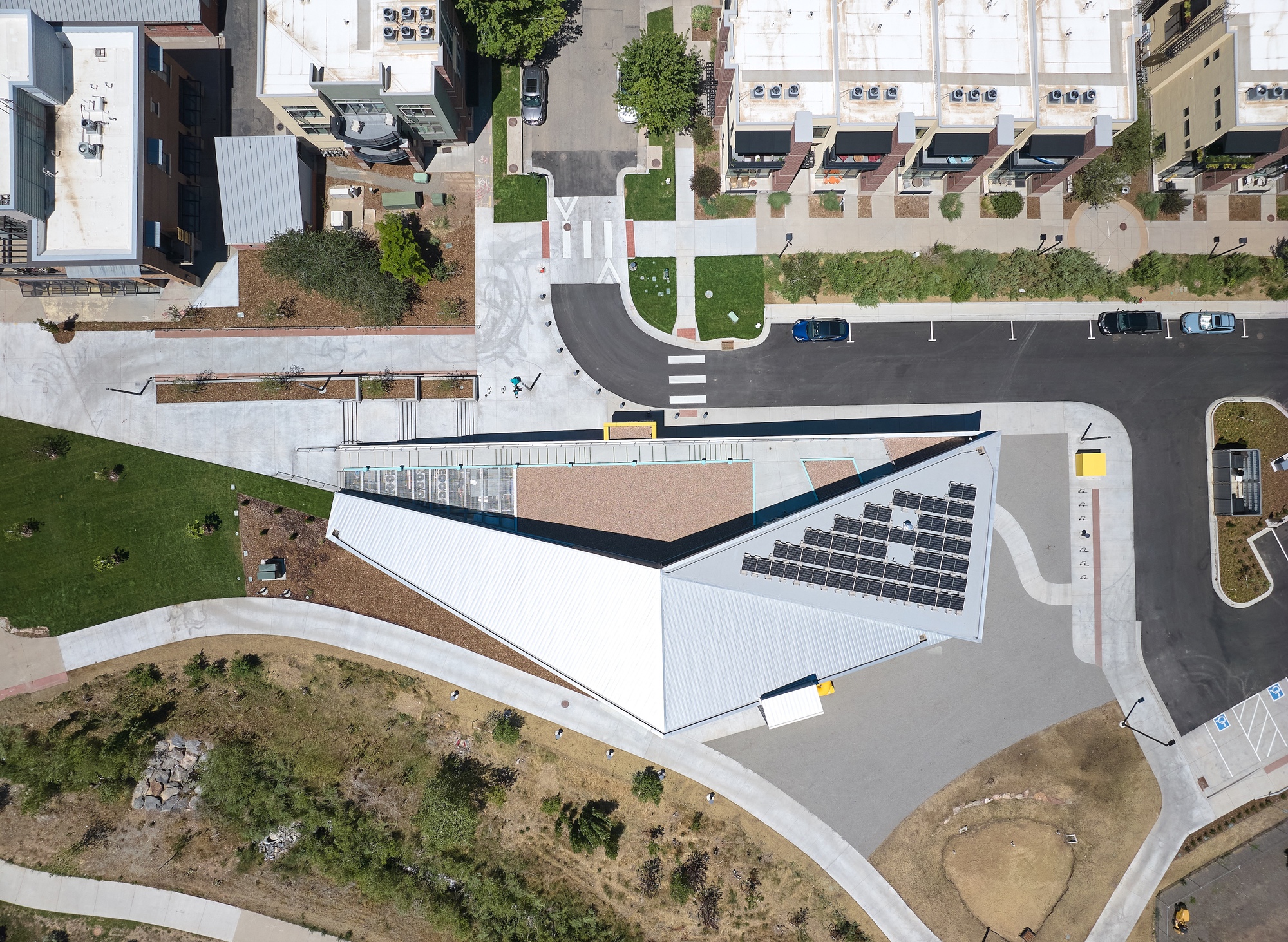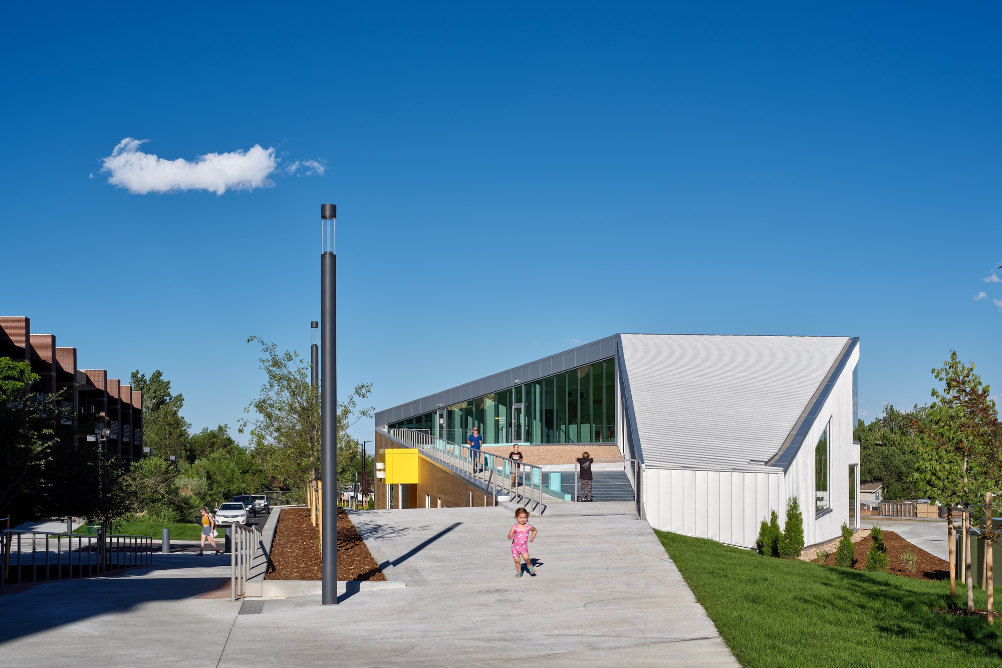 This ramp is enhanced by a public art installation by Montreal-based Daily tous les jours that plays music as users ascend or descend. Despite its modest size, the building has four entrances and a variety of public spaces that seamlessly extend outdoors, connecting with both the residential neighborhood to the north and the Fourmile Canyon Creek park to the south.