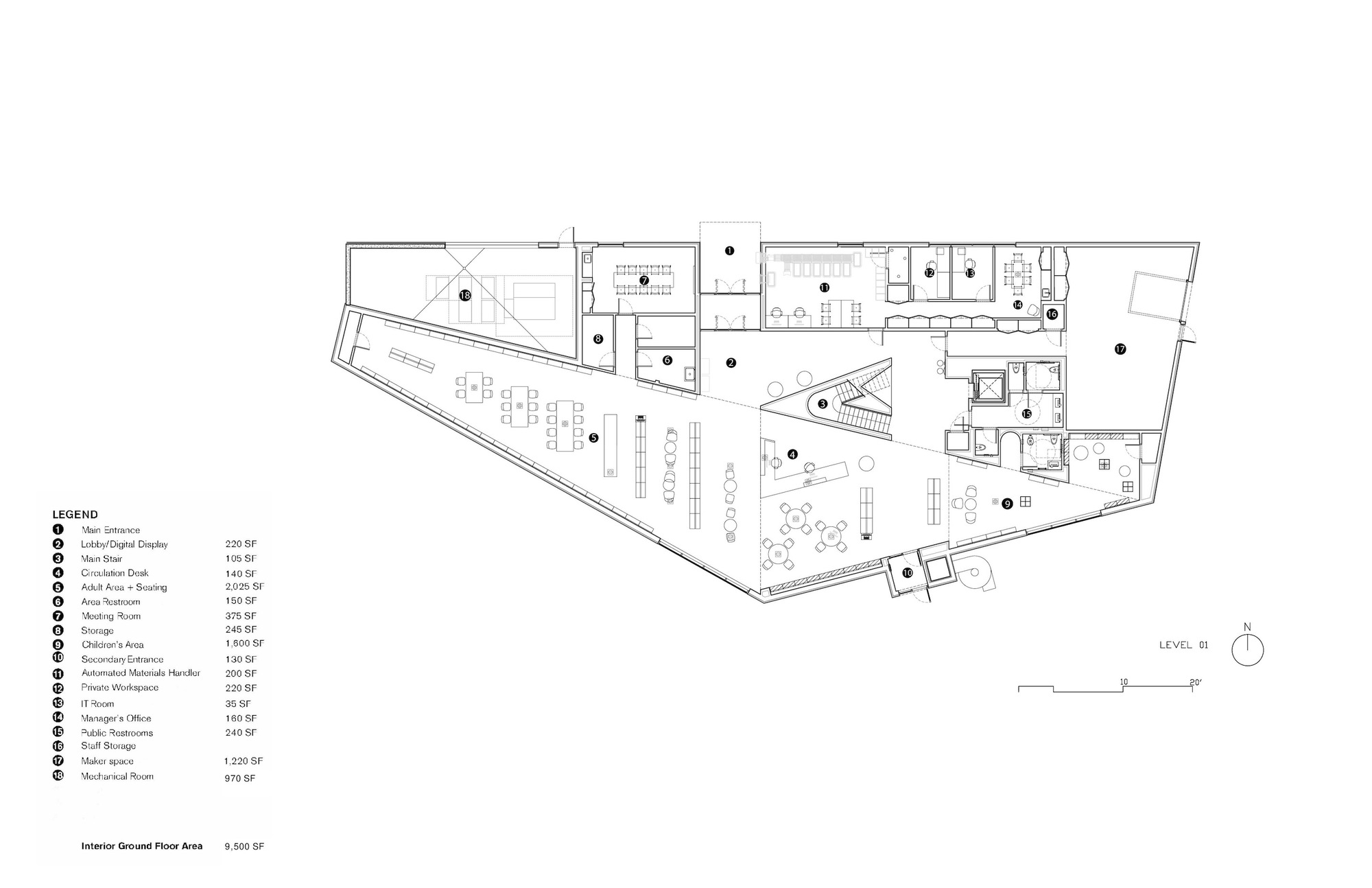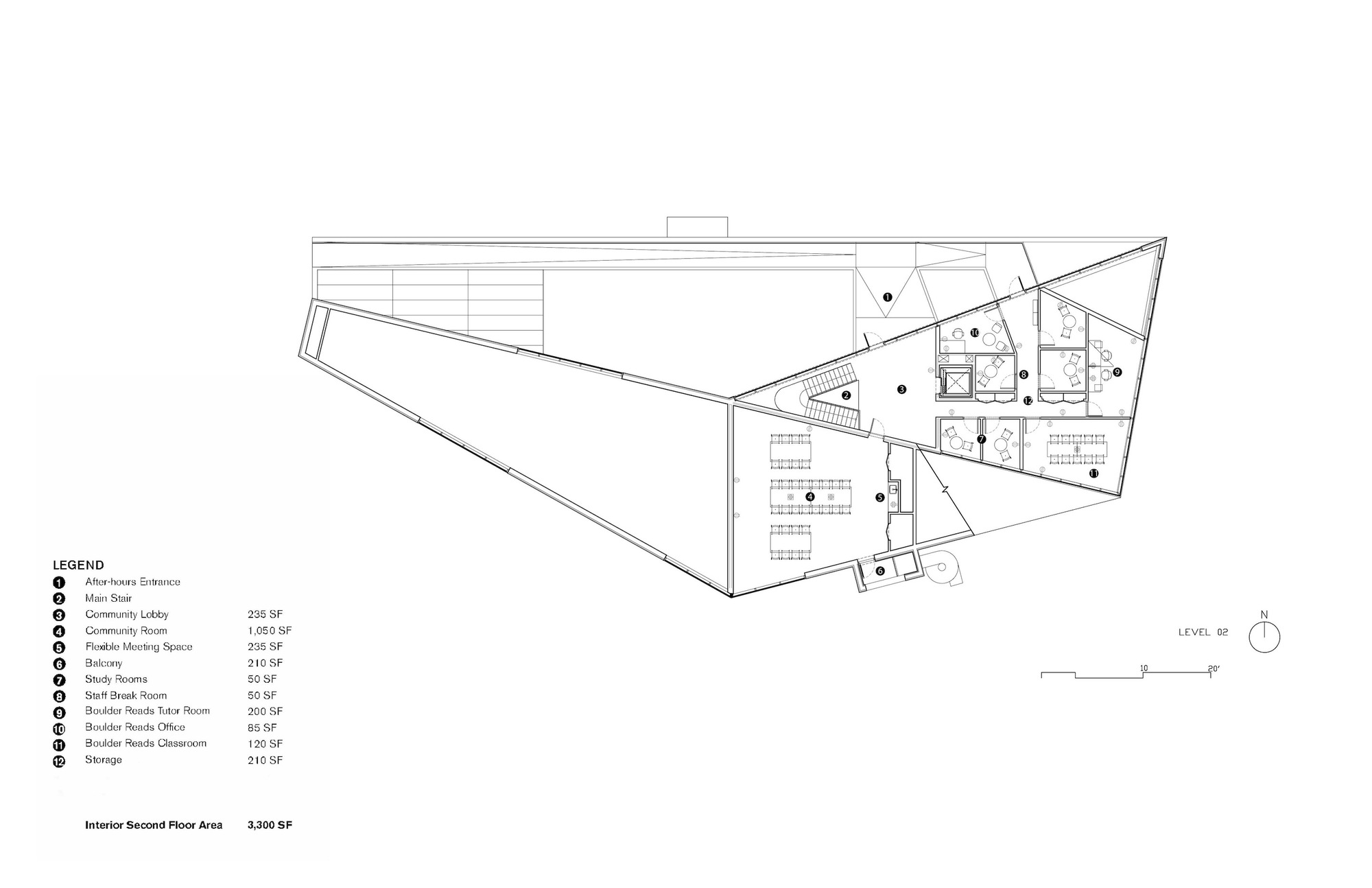 The library is designed with the major community spaces on the second floor. The lower northern side integrates a shallow, fully- accessible ramp that allows these second-floor community and ESL classrooms to open at night when the library is closed, reinforcing the library's role as a community hub.