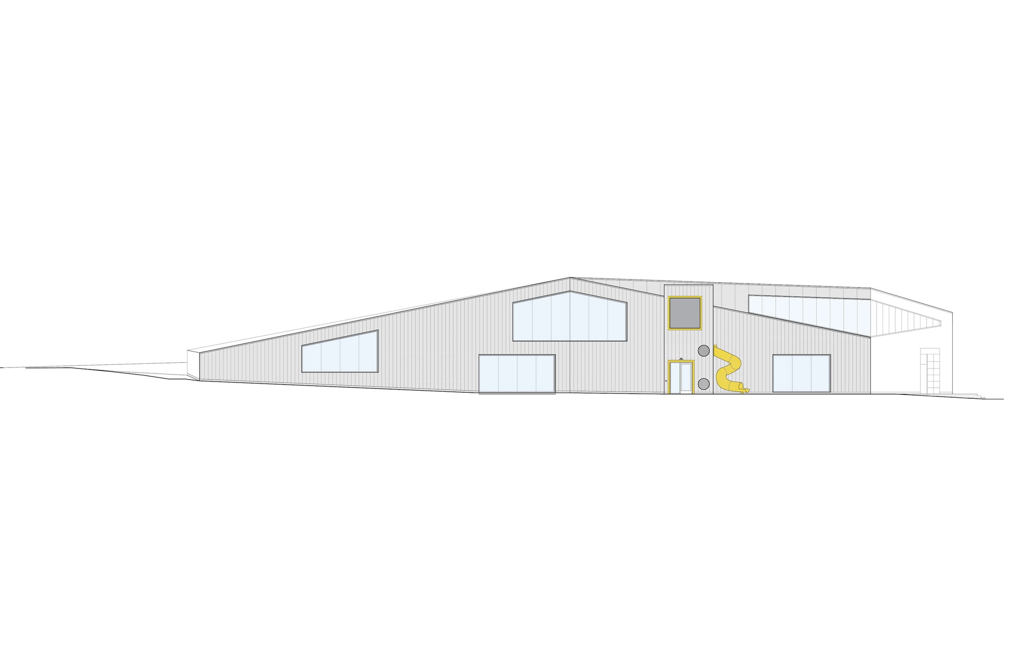 The main public floor is divided into a large reading room for adult patrons and a children's area with a private nook for story-reading and windows onto a slide that can be accessed through a rope climbing structure, allowing kids to climb up through the building and slide down into the library's new playground.